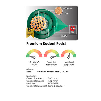 Nel corso degli anni il cavo presente nel terreno subisce una grande pressione. È importante preservarne sia la conducibilità che l'isolamento. La peculiarità di questo cavo perimetrale è la qualita superiore del materiale conduttore: rame stagnato , materiale isolante: HDPE +TPE. Questo cavo ha una maggiore resistenza ai roditori grazie al doppio isolamento. Grazie all'ampia area del conduttore, il cavo ha anche una resistenza molto bassa per massimizzare le possibilità per i rasaerba robotizzati di percepire il segnale dal cavo di segnale.